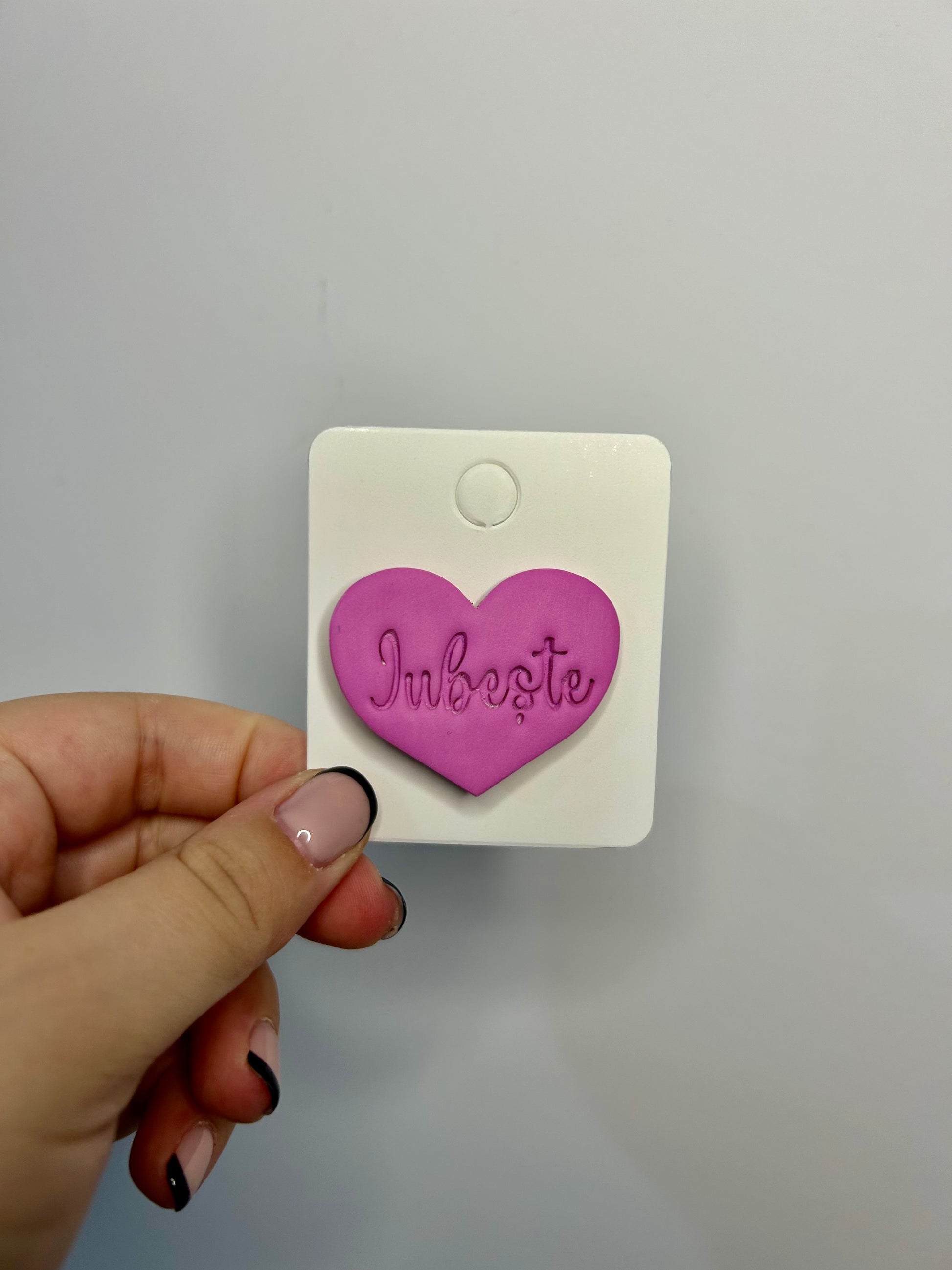 Broșă inimă iubește din lut polimeric lucrată manual